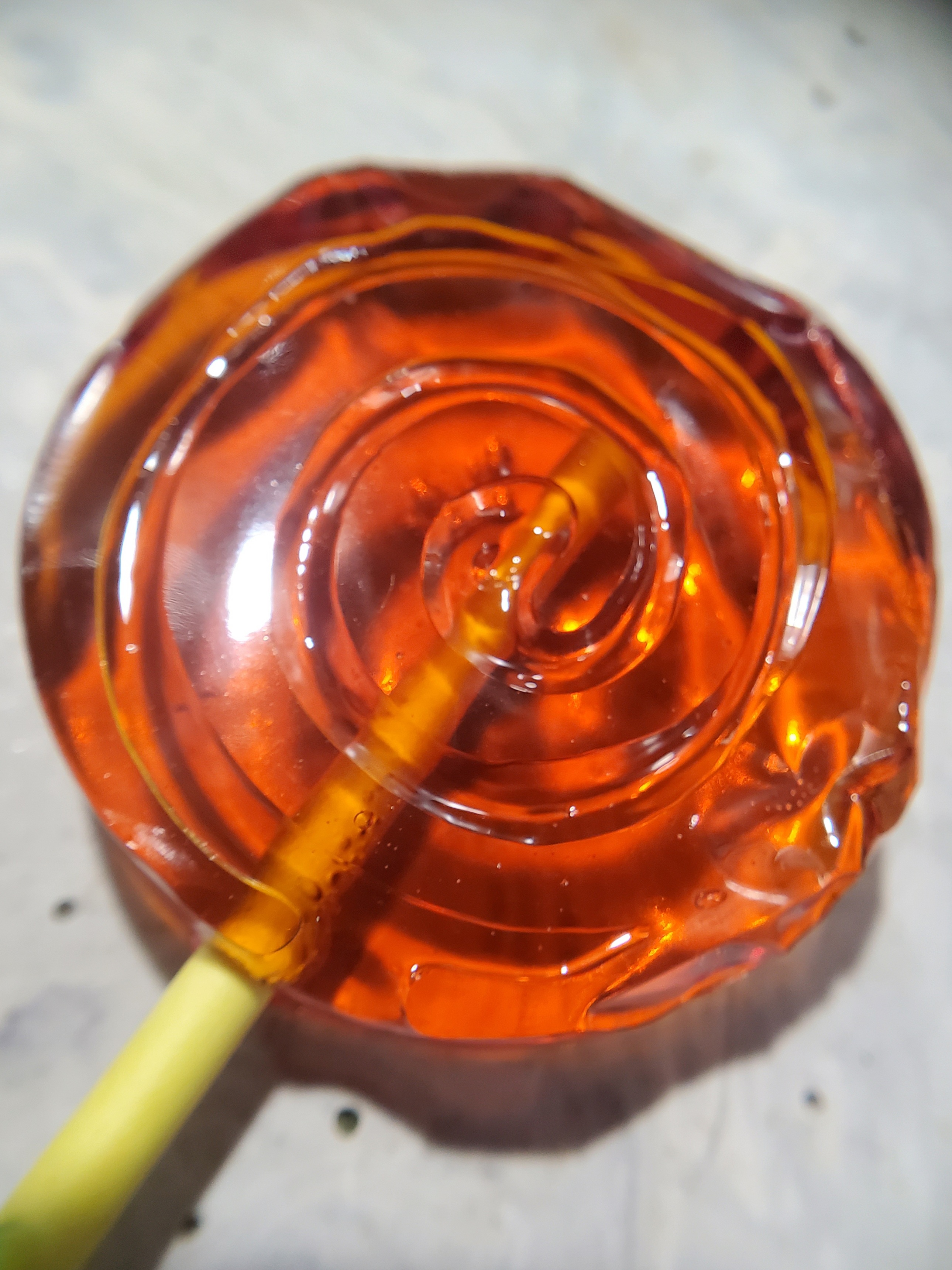 Visual/Texture - this Pineapple Lollipop coming with the candied portion wrapped in a vinyl plastic, sitting inside of a customized mylar package. Perfectly rounded transparent orangish peach colored swirl, sitting on top of an easy to grip lengthy handled stick