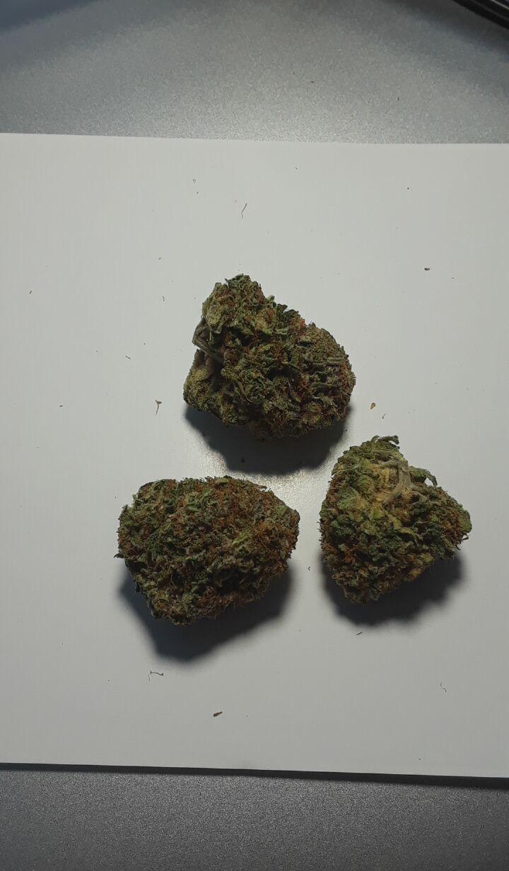 MATARO BLUE - Light sweet blueberry smell to it. Mixed green colors, dark orange hairs, dense, sticky and crystally. Size of nugs is medium. Relaxing body high. Give this strain a try if your dealing with insomnia. The high levels of THC help relax my muscles. Within an hour my eyes just shut! The burn was very clean as well and has smooth spice taste to it!
