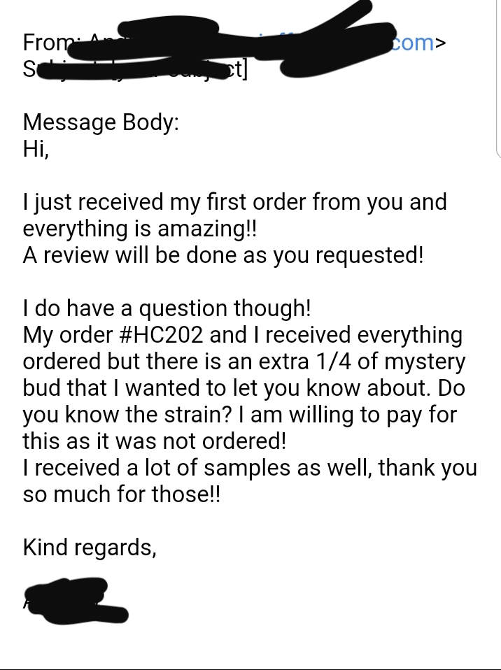 @Harmony , please, use the glass bottles for larger orders.. nothing sucks more than getting a completely pressed 1/2oz of supposed “AAAA” you just bought for $130 in a silly cheap not even ziplock bag. Last time I saw that was when I was picking up bush 1/4’s from the corner.