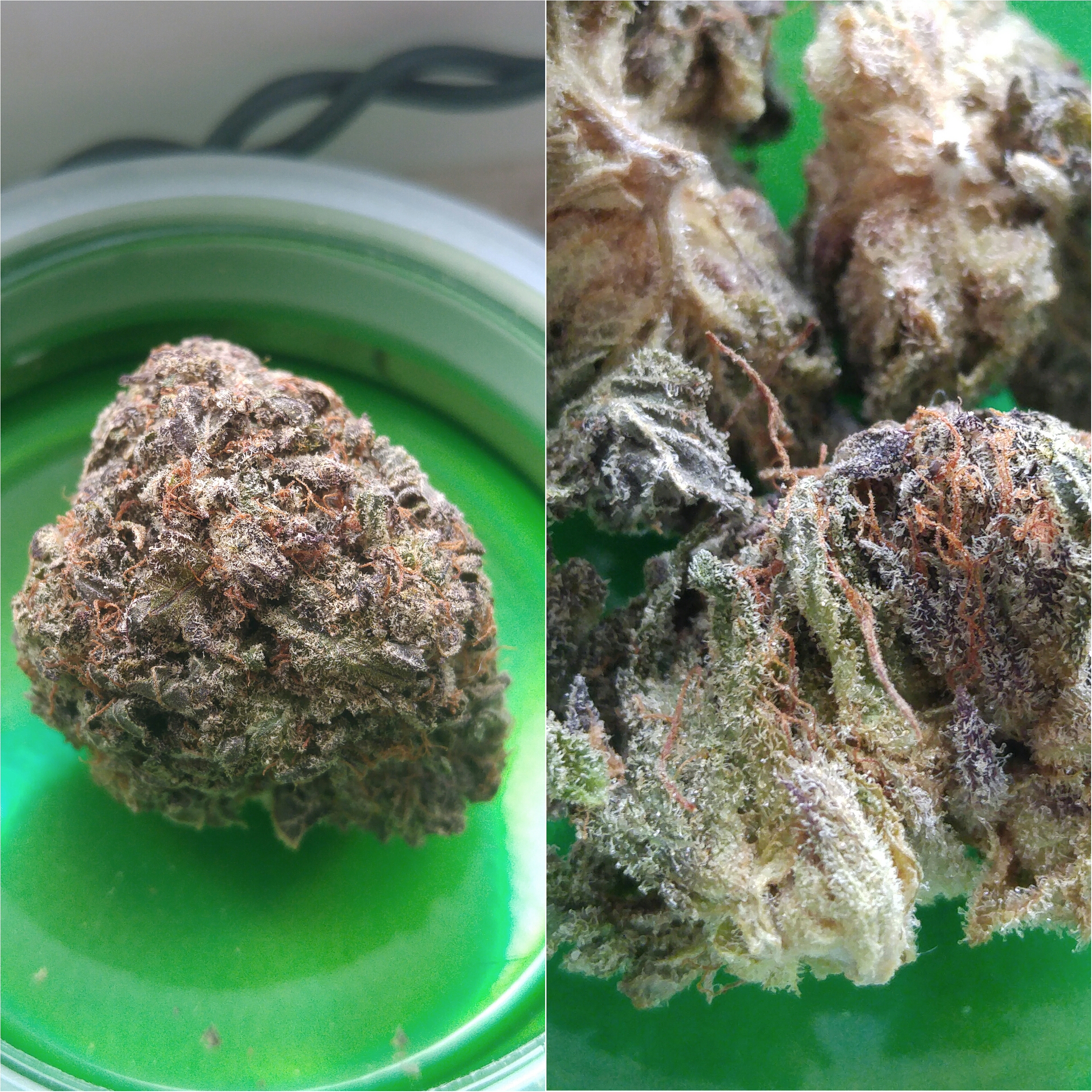 Probably my favorite out of the bunch for sheer aesthetics and bag appeal. Beautiful shades of light greens and dark greens with a vibrant purple that is covered by a blanket of trichomes and a great trim to go along with it. Sticky and dense and has an intense earthy and sweet aroma with hints of grape/berry. Very similar to mendocino purple in profile and effects. Would definitely put this in the before bed category as it had me feeling quite lazy and relaxed before undoubtedly falling asleep.