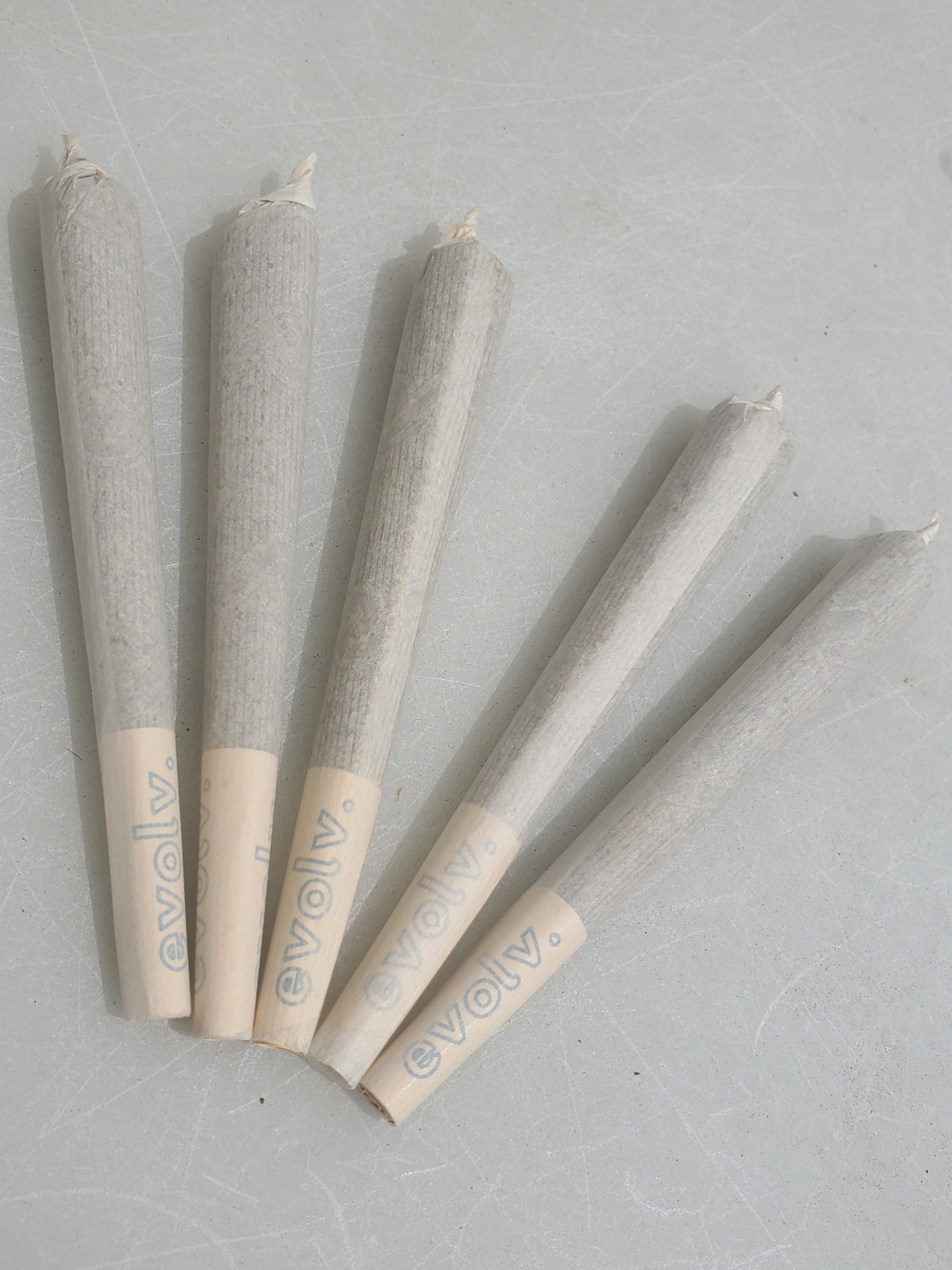 Visual - five conical pre-rolls twisted up in Evolve brand papers, cased inside of a pop top doob tube, ready to be popped out and puffed on. Perfectly spun with a lengthy filter, and the tip folded into itself to guarantee no loose unwanted debris